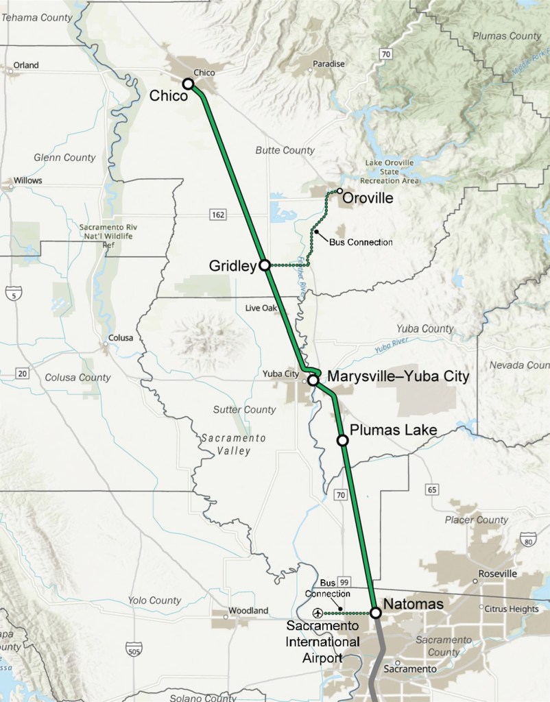 *Note: Shuttle buses will provide timed connections to and from Oroville via Gridley, and link the Natomas station with the Sacramento International Airport.